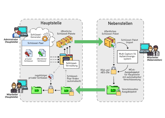 Die Hauptstelle erzeugt Schlüssel-Paare, mit jeweils öffentlichen Schlüssel zum Verschlüsseln und privaten Schlüssel zum Entschlüsseln. Der private Schlüssel verbleibt nur bei der Hauptstelle. Der öffentliche Schlüssel des Paares kann über ein Schlüssel-Paket exportiert, an die Nebenstellen verteilt und dort wieder importiert werden. Eine Nebenstelle kann damit eine automatisch über das Schlüssel-Paket verschlüsselte Paketausgabe von Aufzeichnungen für die Hauptstelle erzeugen. Eine solche Paketausgabe kann nur mit dem zugehörigen privaten Schlüssel der Hauptstelle entschlüsselt werden.