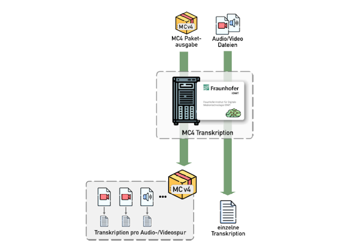MCv4-Transkription ist eine serverbasierte Standalone-Lösung zur automatischen Verschriftung von Audio/Video-Dateien. MCv4-Transkription arbeitet zusammen mit dem bekannten MCv4 Aufzeichnungssystem, so dass es auf einfache Weise ermöglicht wird, die im MCv4 Ausgabepakete enthaltenen Audio- und Videospuren über eine automatische Spracherkennung zu verschriften. Der Kern der Spracherkennung stammt aus langjähriger Forschung und Entwicklung des Fraunhofer IDMT (Fraunhofer-Institut für Digitale Medientechnologie) und wird im Rahmen einer Zusammenarbeit für die bestehenden MCv4 Lösungen zukünftig weiterentwickelt.